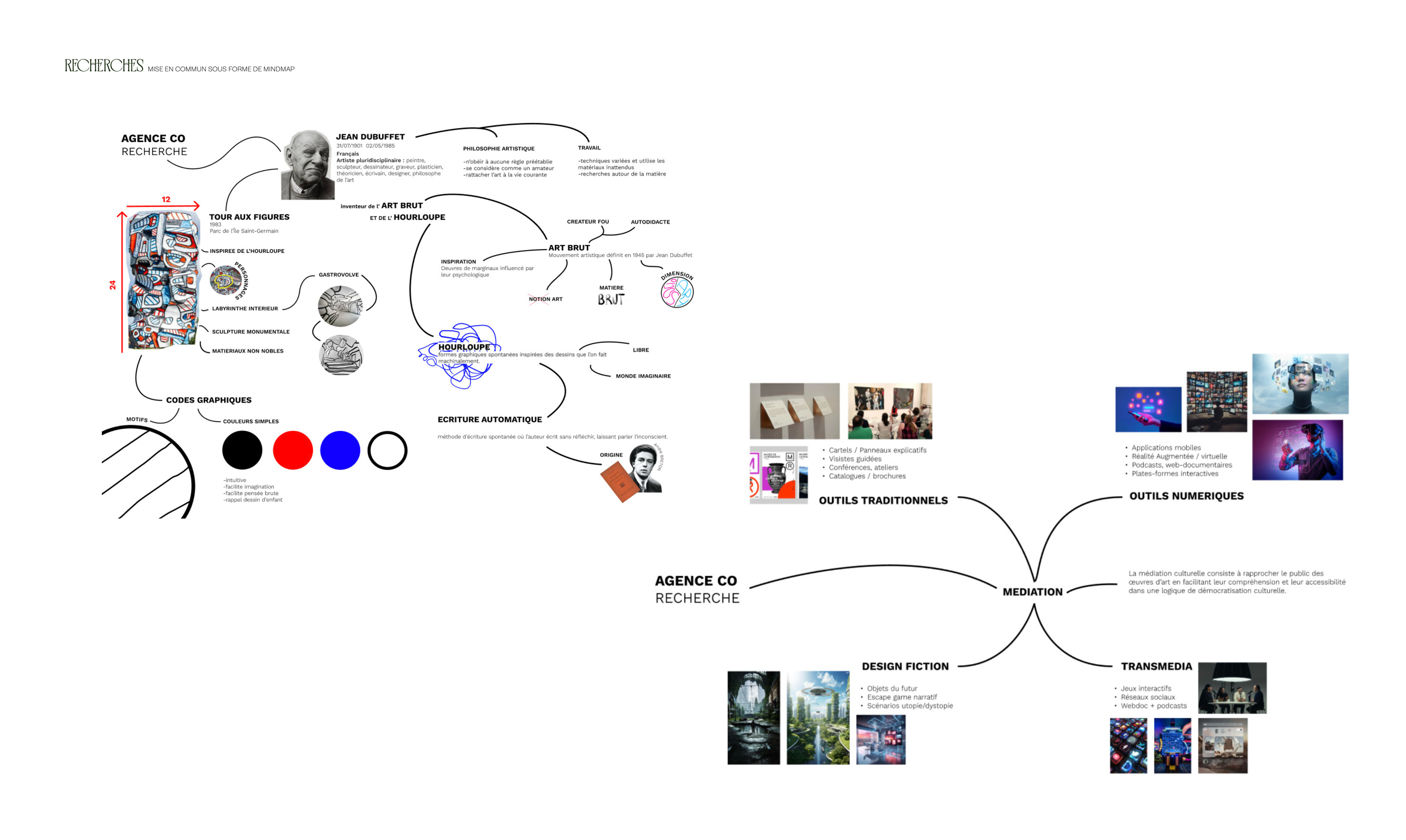 This project is being carried out in partnership with Jean Dubuffet's Tour aux Figures and revolves around the question: What might the Tour aux Figures look like in 2050? Divided into “agencies,” we conducted research and held discussions to imagine a possible future for this iconic site, developing a synopsis within the Co agency that proposes transforming the tower into a living ecological sanctuary, combining art, animal refuge, and plant autonomy.